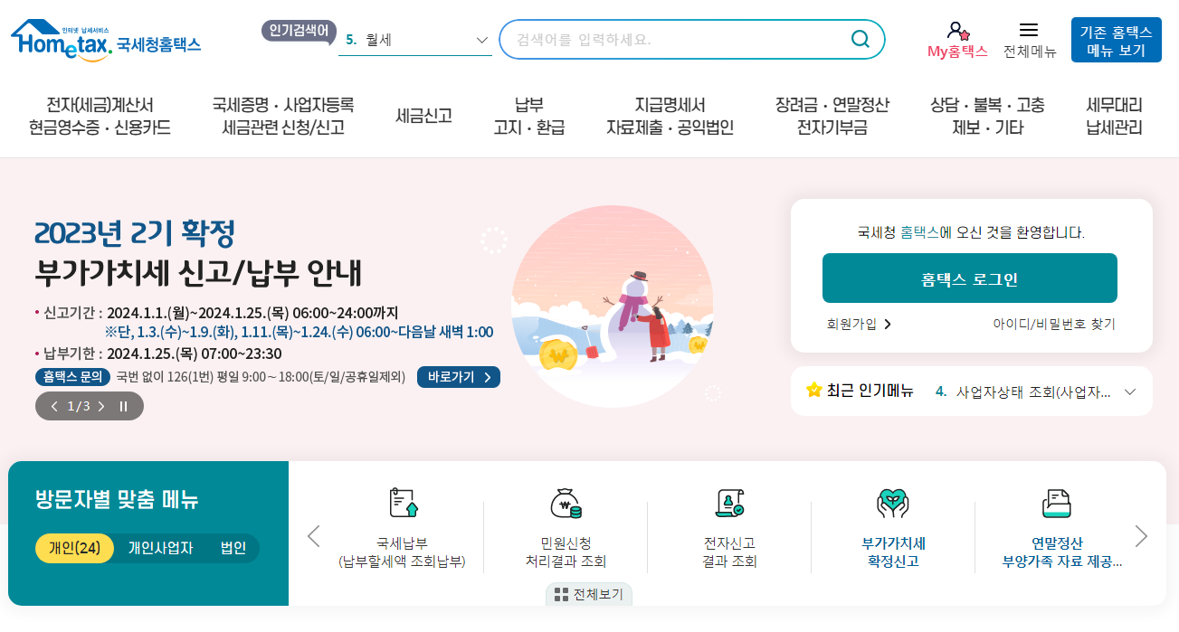 국세청에서는 인터넷 납세서비스를 위하여 홈택스를 운영하고 있습니다. 연말정산, 전자세금계산서, 종합소득세, 현금영수증, 근로장려금 등 다양한 업무를 홈택스에서 지원합니다. 따라서 국세청 홈택스 홈페이지를 이용하여 세금 관련 업무 간편하게 처리하시기 바랍니다.