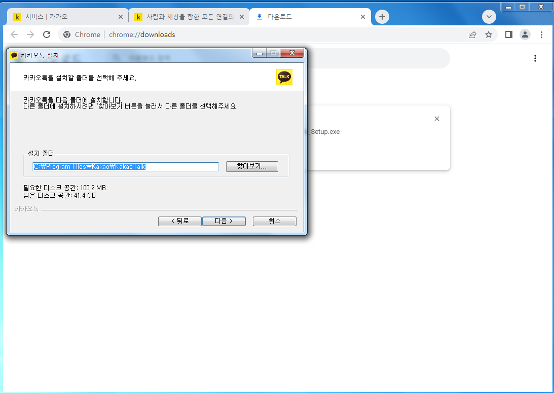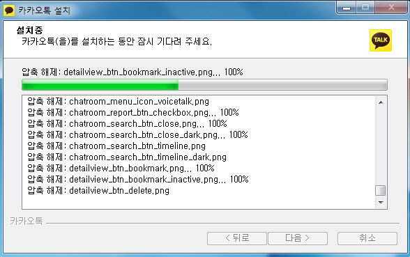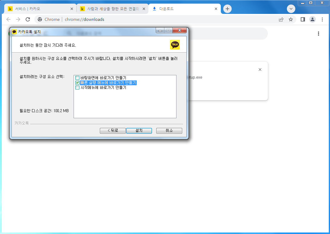카톡 PC버전 설치가 진행될 폴더를 지정하고 구성요소를 선택해주십시오. 그러면 이제 인스톨이 잘 진행됩니다. 이제 카톡 PC버전 다운로드 및 설치가 완료되었습니다.