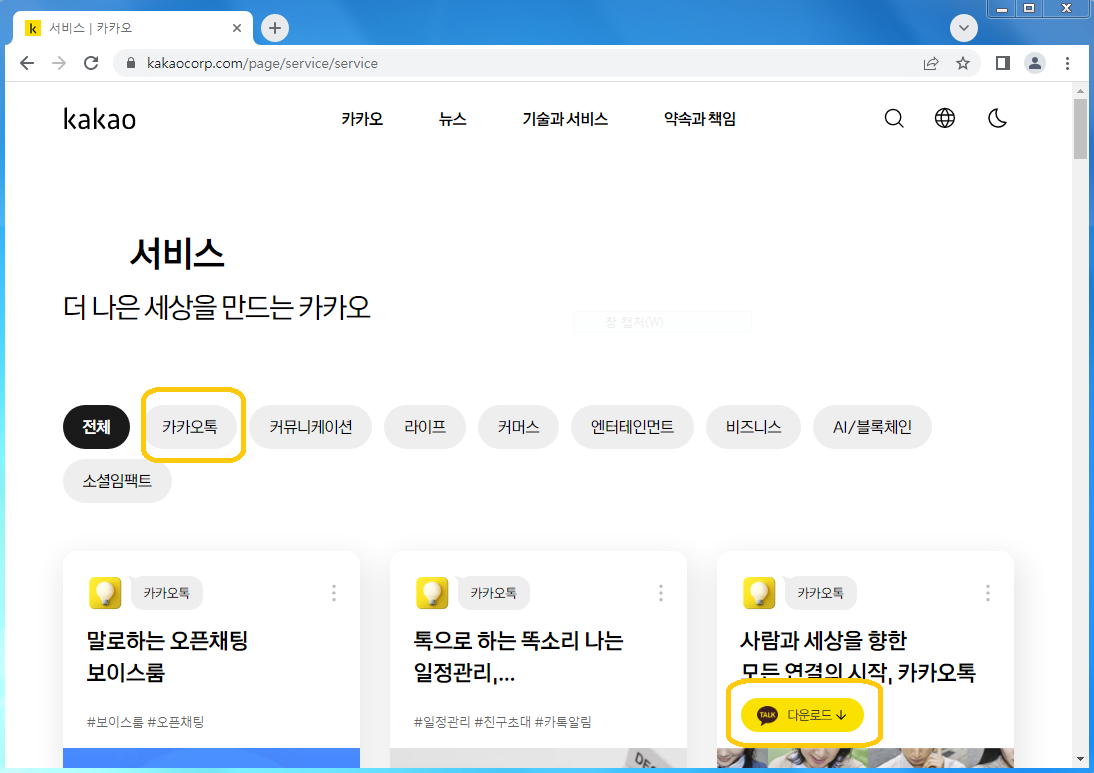 여러가지 카카오에서 제공하는 서비스에서 대표격인 카카오톡은 바로 확인이 되어집니다. 다운을 할 수 있는 부분이 보이게 되구요.