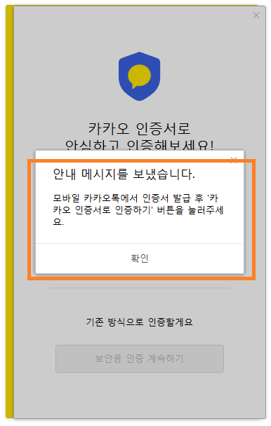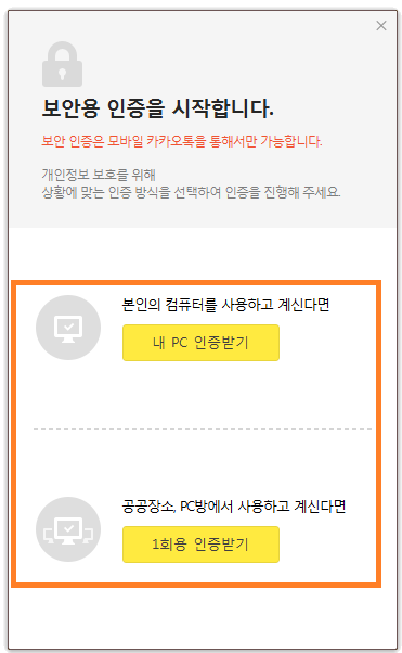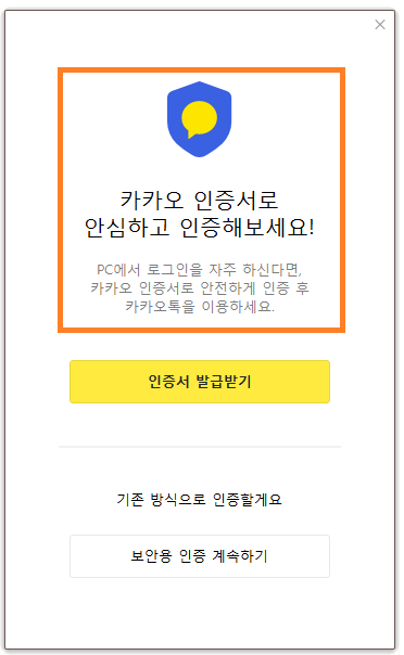 처음 카톡 PC버전 다운로드 후 설치 로그인까지 하셨으면 인증을 거치게 됩니다. 인증서나 보안용 인증을 거쳐서 내 PC를 안전하게 검증하시길 바랍니다.