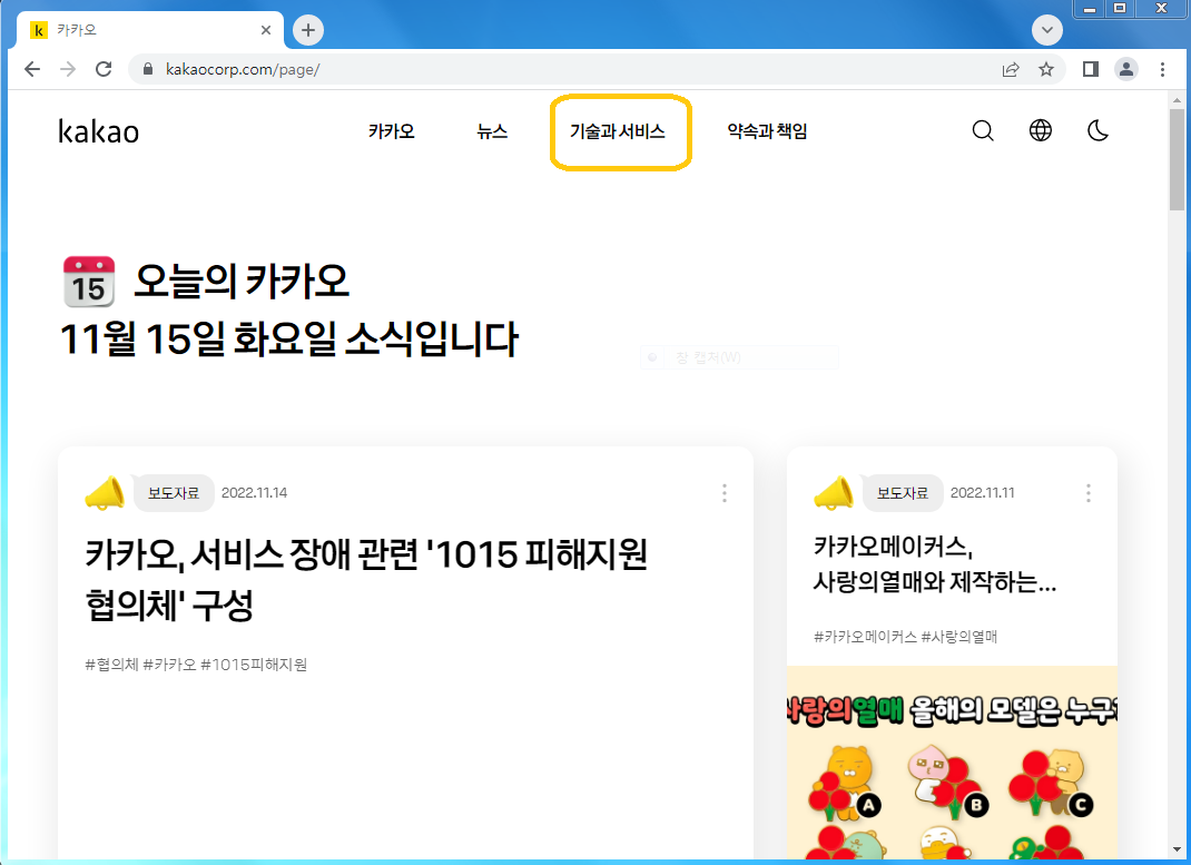 홈페이지에서는 카카오의 다양한 소식들이 확인됩니다. 현재는 서비스 장애관련된 내용이 주를 이루지 않나 싶네요. 아무튼 여기에서 상단에 있는 기술과 서비스 부분에서 서비스로 들어가주시기 바랍니다.