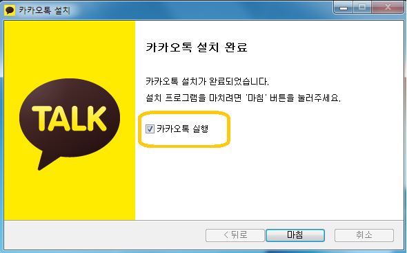 마지막 화면에서는 카카오톡 실행이 보이면서 마침 버튼이 보입니다. 이를 통하여 컴퓨터에서 카톡 PC버전 실행을 하시면 됩니다. 이 후에는 바탕화면이나 빠른실행 등에 생긴 아이콘을 통해 열면 됩니다.